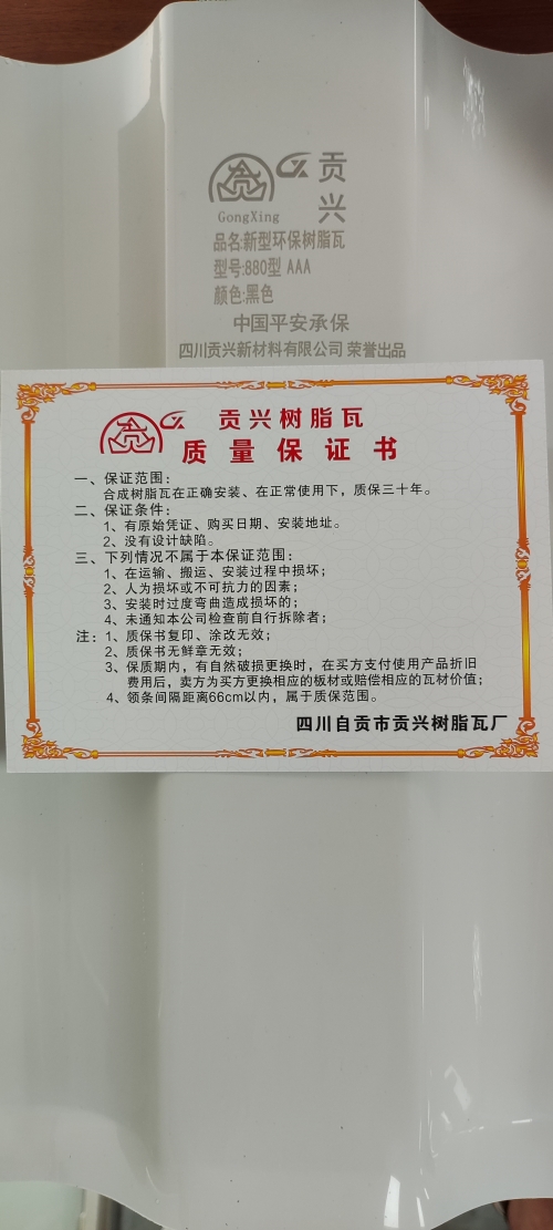 貢興樹脂瓦,通過國家各項檢測認證,購買貢興樹脂瓦,質量保證不光是靠嘴說,會有質量保障書,不同規(guī)格都有對應的使用年限保證,并由平安保險公司承保,保障期間出現(xiàn)問題,極速理賠。